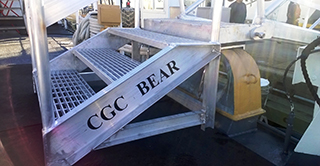 This 22' aluminum gangway provides access to the USCG Cutter Bear, homeport Portsmouth Virginia. It features security rail and I-bar grating, the set of steps help to complete the safe transition onto the vessel..