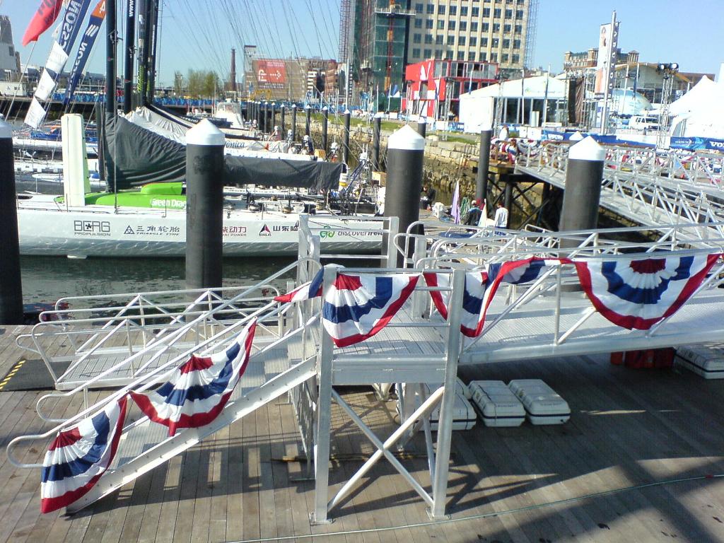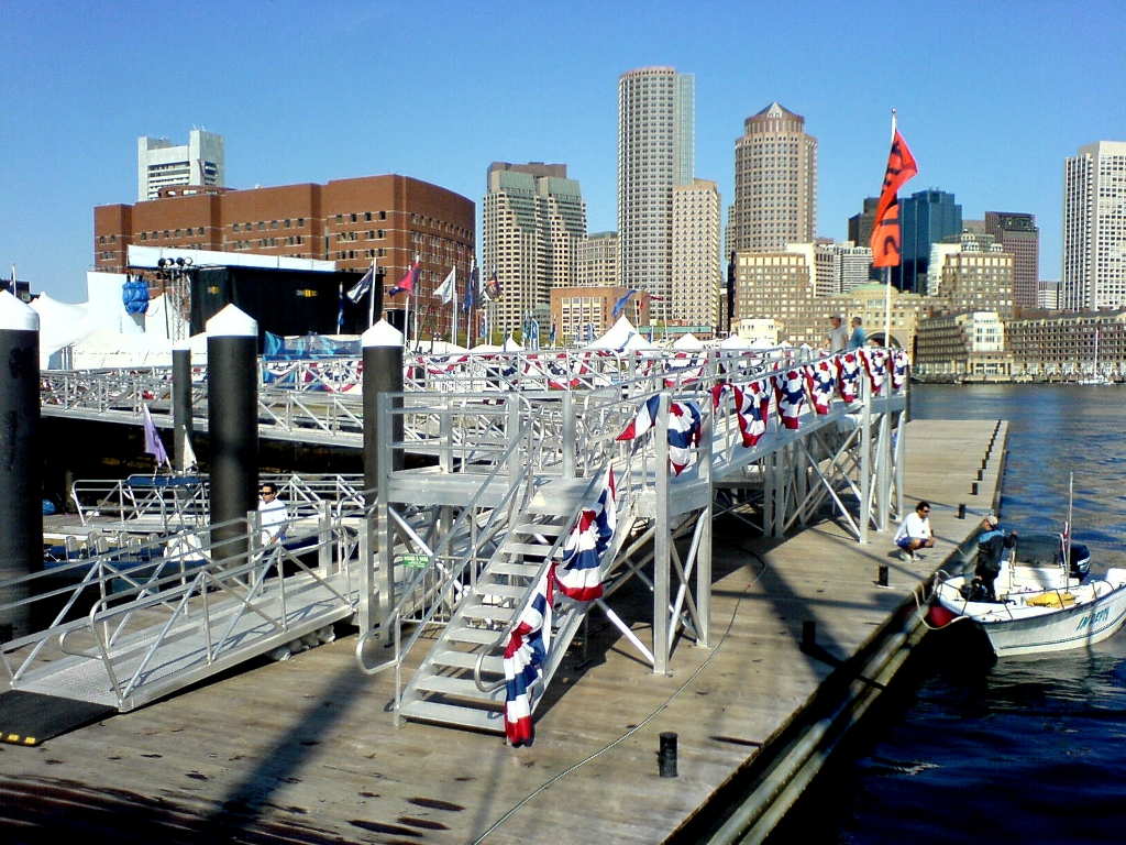 | Boston Fan Pier - A new marina and condominium complex in South Boston owned by the Fallon Group. In 2009, when these pictures were taken, the marina was hosting the Volvo Ocean Race. Boston was the only North America stop in this around-the-world ocean race. The gangway system consists of a series of aluminum gangways and platforms in a switchback configuration to make the floating dock ADA accessible through Boston's ten foot tide cycle. |
