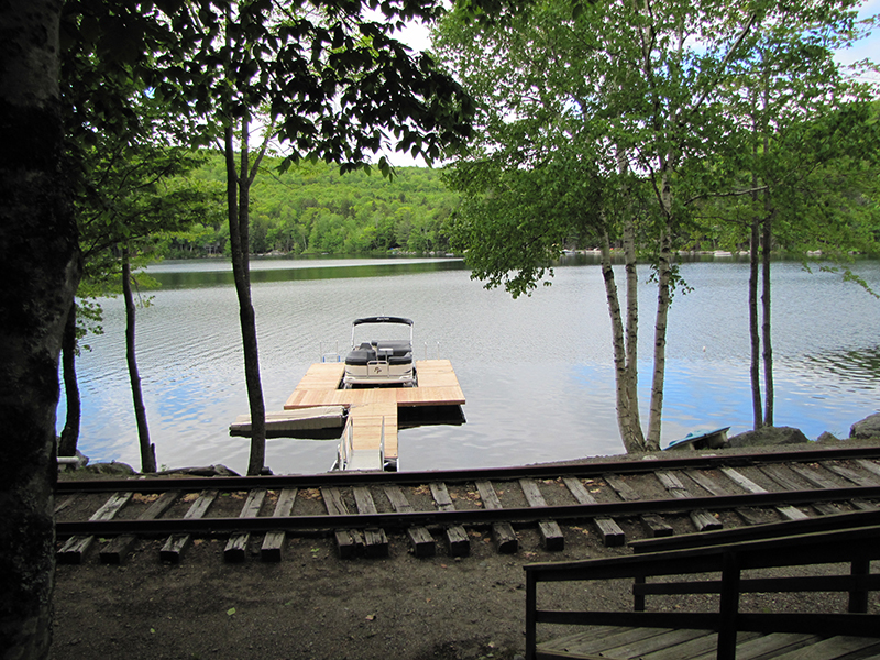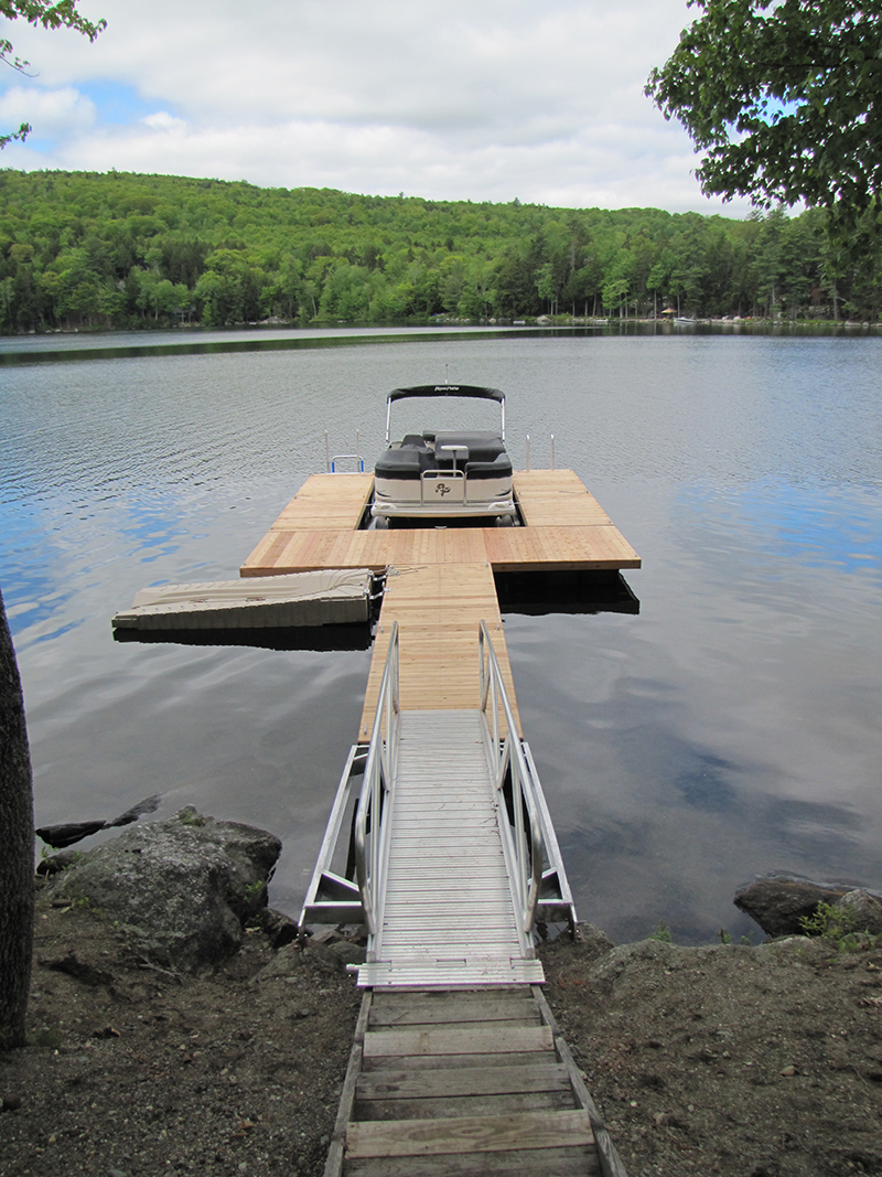 This system, located on Philips Lake in Lucerne, Maine, starts out with a 20' x 30" wave style gangway. The gangway lands on a 5' by 20' long finger float that connects to an 8' x 20' main float. Two more 5' x 20' finger floats form the berth for the pontoon boat. The left hand offshore end has a kayak launching platform and the right hand side a 4 rung swim ladder. The aluminum framed floats have roto-molded flotation drums and were decked with cedar decking to give it a more traditional look. The customer reports that the dock has become the focal point of activities with enough room for everyone and a few lawn chairs. |